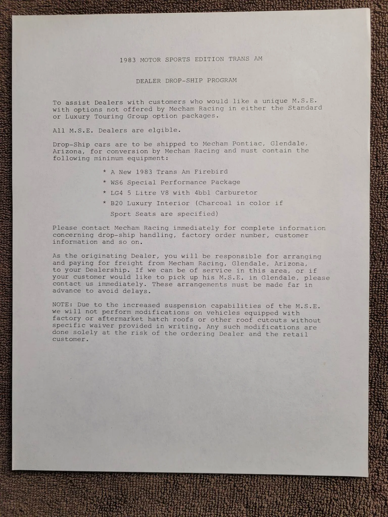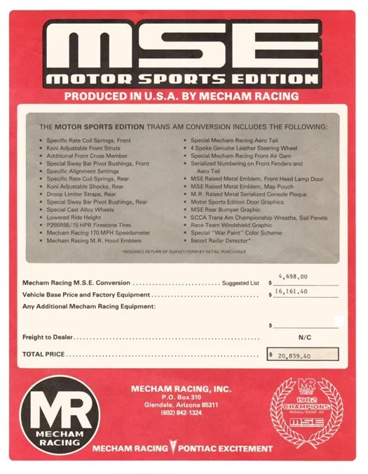 War Paint, Color Coded Badges, 1st Official Mention Of Mecham Racing Windshield Banner, Serialized Numbers On Fenders/Rear Wing, And New “Winners Wreath Decals. Mention Of Front Air Dam (True MSE Air Dam Quietly Replaced with OEM W62 Aero Parts)
