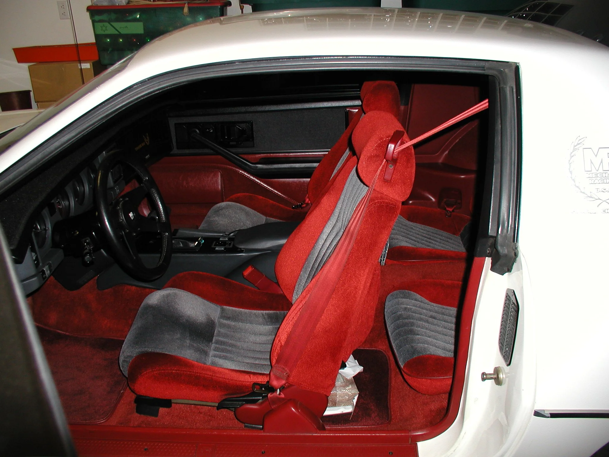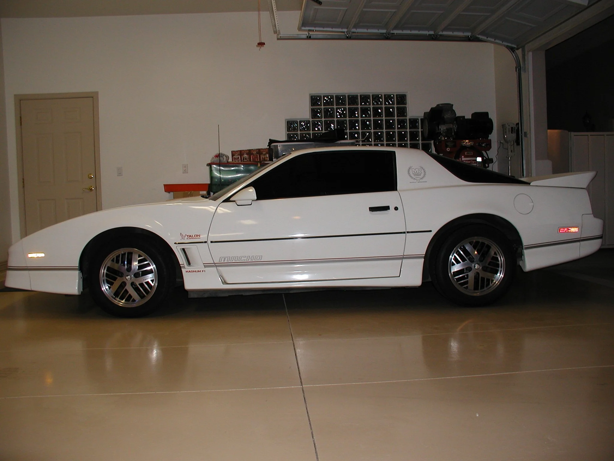 Exterior Badges/Decals: MSE Badges (Hood Nose Badge). Sail Panel “Winners Wreath” Decal, Production Number On Rear Wing, and the Headlight. Windshield Banner. Talon Suspension On Fenders. Magnum FI Or H.O FI (350 Cars) On Ground Effects. “Macho” On Doors, Front Bumper, And Rear Bumper. Pin Strip Around Rear Hatch (1985 #3), Large Macho TA Door Decal. Lower Duel Pin Stripes.
